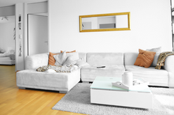 Parkett Eiche versiegelt, Wände weiss gestrichen, vom Wohnzimmer Zugang zum Balkon.